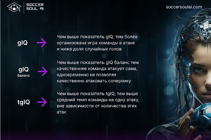 gIQ – качество действий в голевых атаках, с учетом классификации и типологии действий, выраженное в процентном отношении к среднему показателю команд РПЛ, имеющих собственный gIQ выше, чем у соперников (чем выше показатель gIQ, тем более организована игра команды в атаке и ниже доля случайных голов).