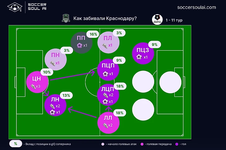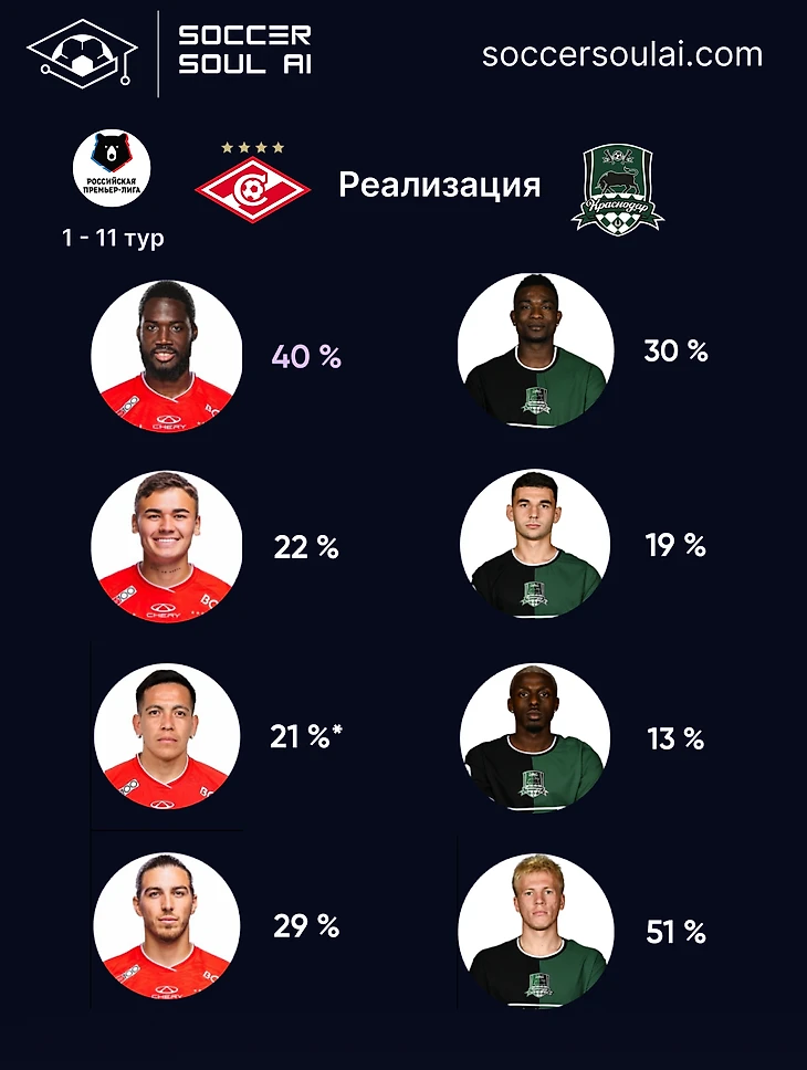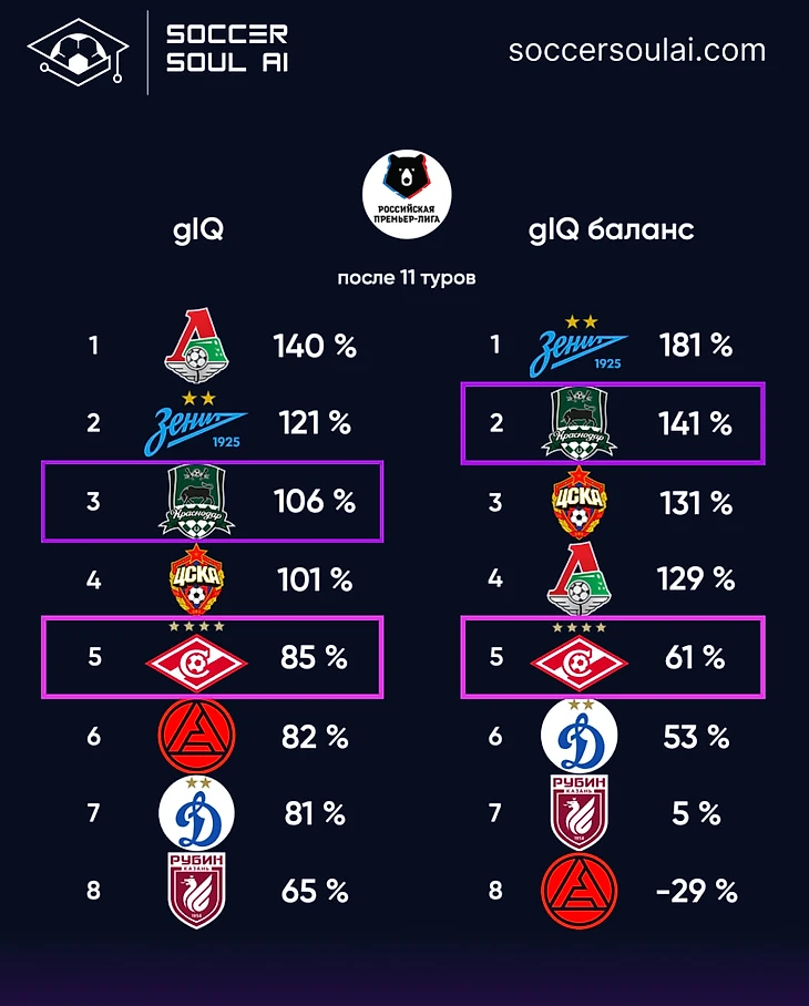 У Краснодара этот показатель 141% - один из лучших показателей баланса в РПЛ, что указывает на отличное сочетание атакующих и оборонительных действий команды.