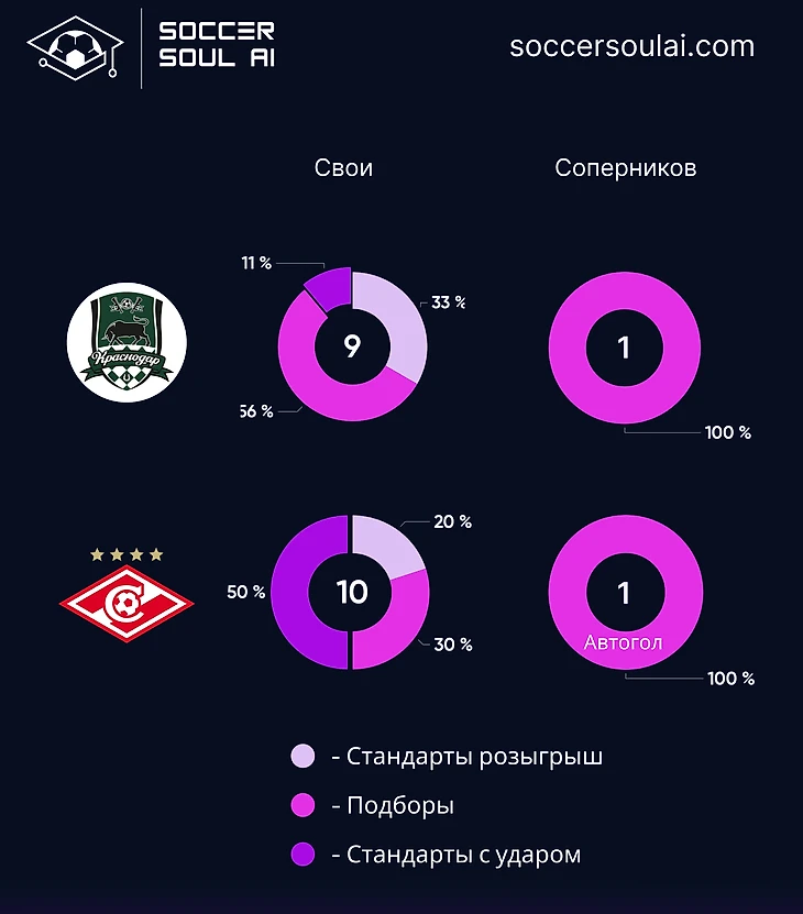 Классификация голевых атак обеих команд говорит не в пользу Спартака. 35% их атак – спонтанные, но Краснодар так почти не пропускает и подобных шансов сопернику не даёт!