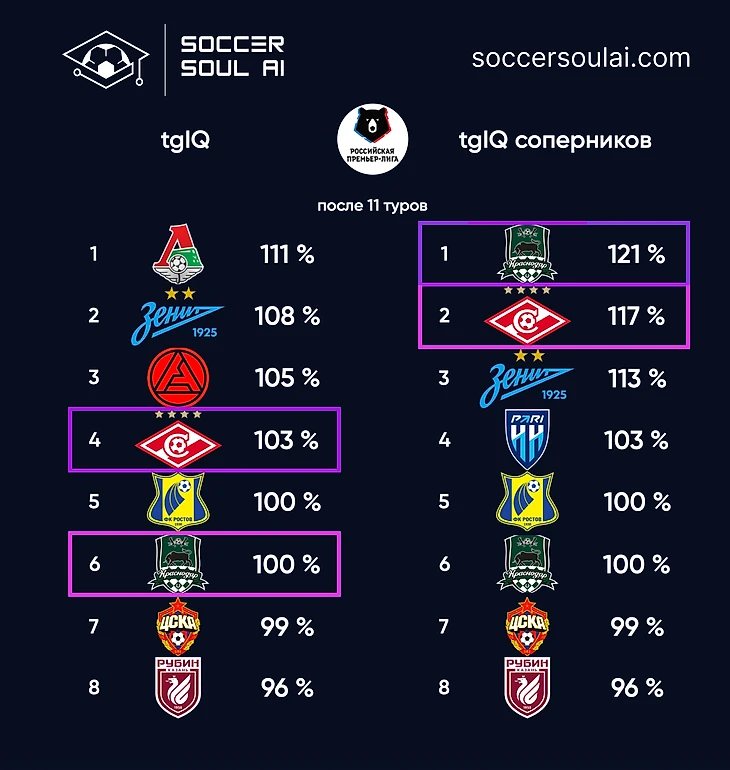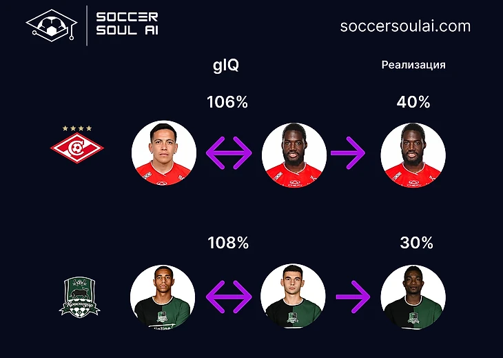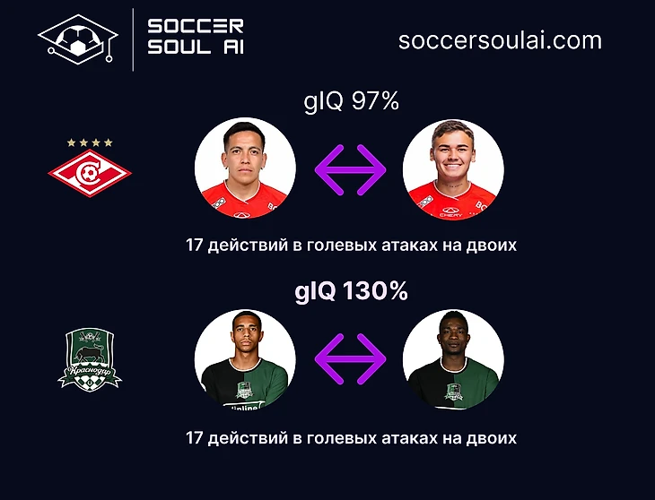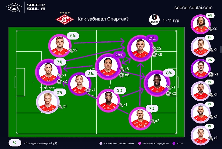 gIQ Спартака - 85%. Показатель указывает на то, что организация атак «Спартака» ниже топ-команд РПЛ. Их атаки относительно структурированы, но уступают по качеству лидерам.