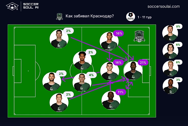 Краснодар: 13 игроков участвовали в голевых атаках, и четверо (Кордоба, Батчи, Сперцян и Са) имеют вклад более 10%. Это указывает на, как минимум, вдвое более разнообразную атаку. При этом, как все дороги ведут в Рим, так и все (почти) передачи команды через АВП ведут на Кордобу.