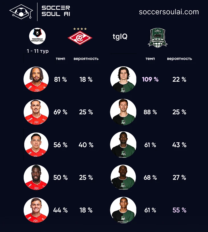 В составе обеих команд есть лишь один футболист имеющий средний темп продвижения в голевых атаках выше 100% (Козлов - Краснодар)