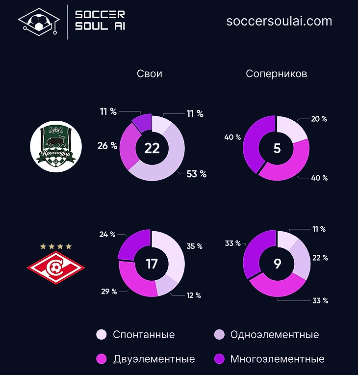Классификация действий обеих команд говорит не в пользу Спартака. 35% их голевых атак – спонтанные, но Краснодар так пропустил лишь однажды и подобные шансы соперникам предоставляет редко! В свою очередь у гостей лучшие результаты дают двухэлементные атаки (36%), и они-то как раз бьют по болевым точкам москвичей (по 33% пропущенных мячей в двух- и многоэлементных атаках).