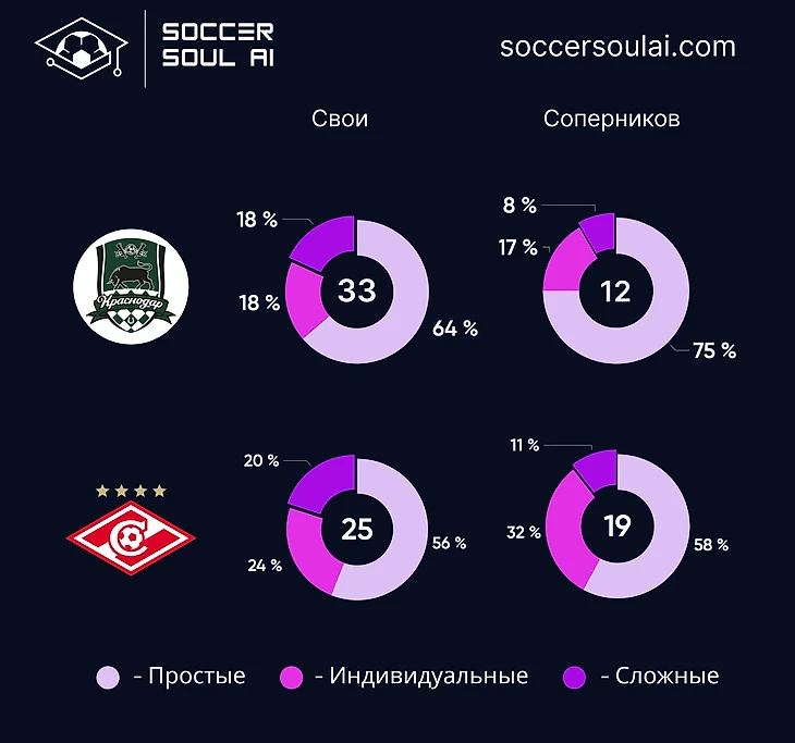 С точки зрения типологии игровых действий картина определенным образом уравновешена. Краснодару чаще создают проблемы простые игровые действия соперников (75%), а у Спартака они ниже среднего (56%). В то время как проблемные для москвичей индивидуальные элементы (32%) ниже среднего в арсенале Краснодара (18%). Вероятно, решающей в матче станет не типология, а комбинационная составляющая атакующих действий.