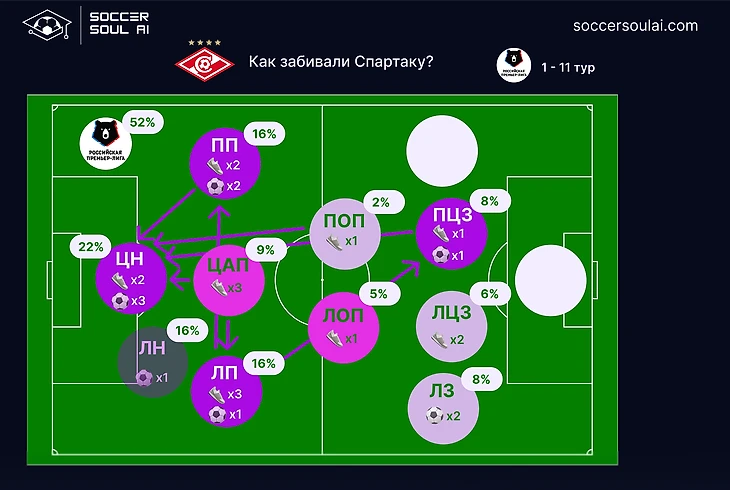 Баланс качества атакующих действий Спартака положительный – 61%, но не самый высокий в лиге, что говорит о том, что они не идеальны в защите и недостаточно эффективны в атаке в сравнении с лидерами РПЛ.