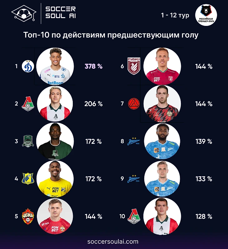 Противоположная картина у Воробьёва, который имеет наименьшую долю в командном gIQ (15%) среди футболистов ТОП-10 РПЛ. Но, Локомотив как раз конкуренцией не обделён – в тех же ТОП-50 сразу восемь представителей железнодорожников.