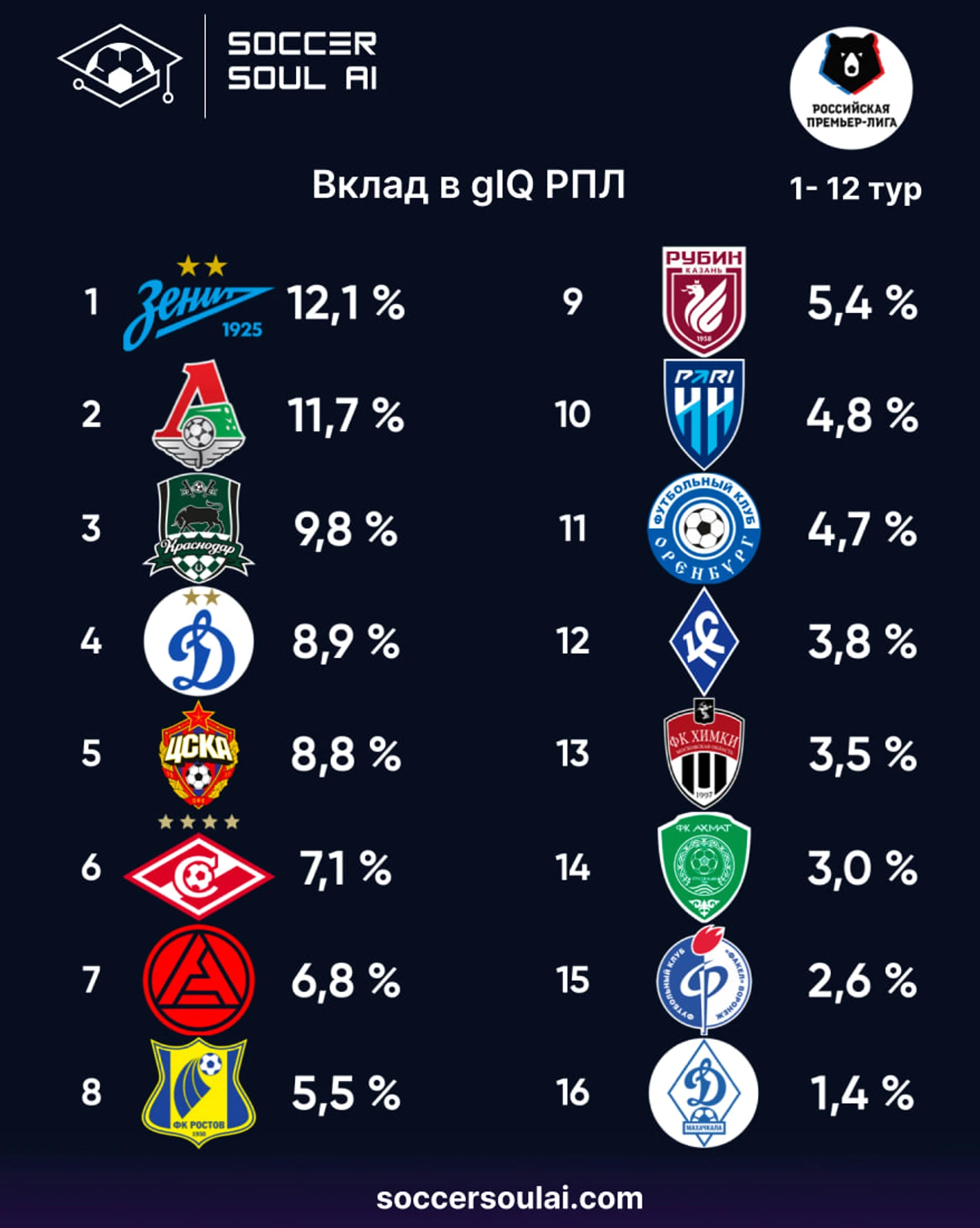 5% — это ТОП-10 РПЛ по вкладу в gIQ всей лиги! Среди лидеров по два представителя Зенита, Локомотива и ЦСКА, по одному – от Краснодара, Динамо, Спартака и Рубина.