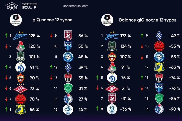 gIQ баланс – уровень сбалансированности собственных атакующих действий. Математически это разница оценки качества действий в собственных атаках и качества действий в атаках соперников, приведенная к среднему показателю команд РПЛ, имеющих положительную разницу значений (чем выше показатель gIQ баланс тем качественнее команда атакует сама, одновременно не позволяя качественно атаковать сопернику).