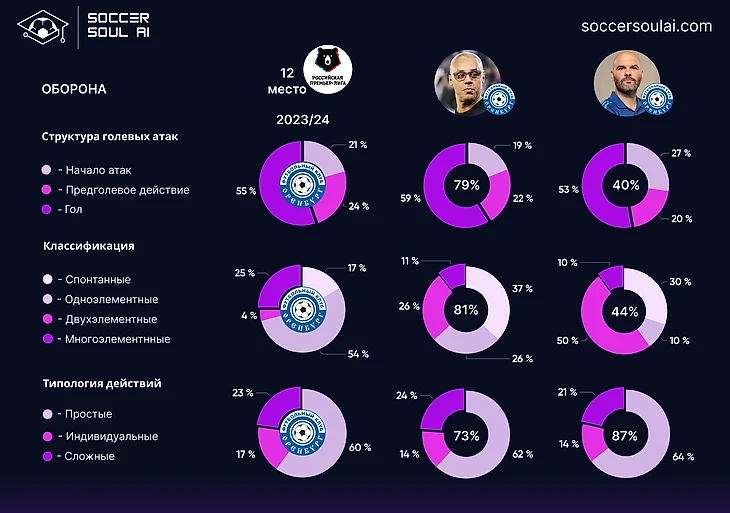 Кроме того, чтобы забить команде Адиева, соперникам в большей степени были необходимы многоэлементные атаки и сложные игровые действия. При Ташуеве проходили более простые комбинации, а 71% действий соперников в голевых атаках составляли коротко-средние и длинные передачи.