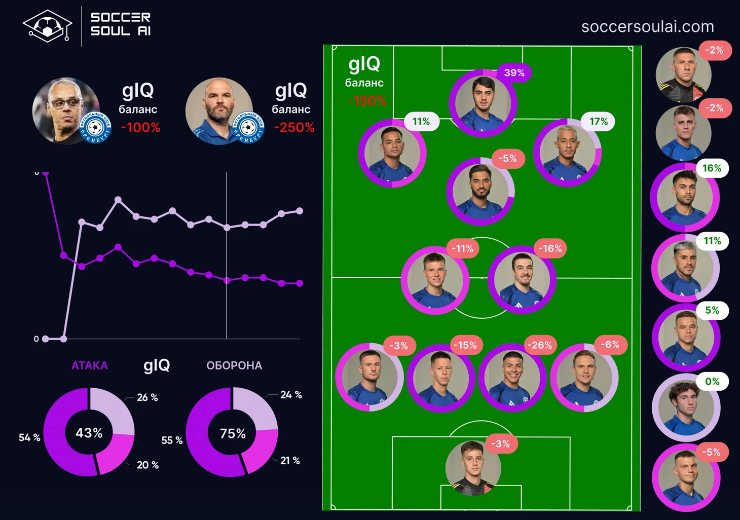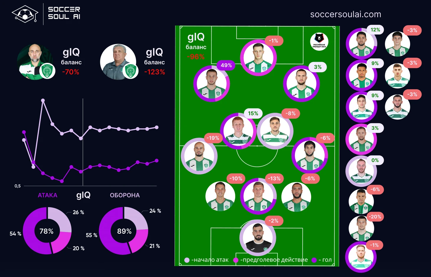 Анализируя качество действий Ахмата в голевых атаках (gIQ), мы наблюдаем заметное отставание показателей команды (78% от ориентира). В оборонительной фазе (качество действий, позволенное соперникам) ситуация чуть лучше, но значение также отстаёт от требуемого (89%).
