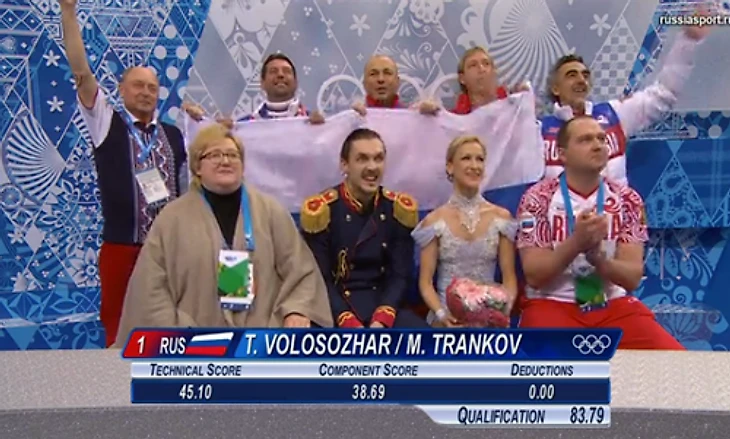 23.07 Кстати, сегодня на трибунах «Айсберга» был замечен главный тренер сборной России по футболу Фабио Капелло. Известный своей любовью к изяществу и балету, он, конечно, не мог пропустить выступление Волосожар и Транькова. Итальянцы, ставшие по итогам дня восьмыми, его вряд ли порадовали.