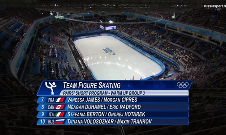 22.28 На лед вышла бодрая французская пара Ванесса Джеймс – Морган Сипре, а Евгений Плющенко присоединился ко всей команде в специальном тим-боксе.