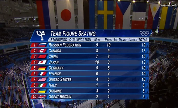1. Япония – 10 очков 2. Россия – 9 очков 3. Канада – 8 очков 4. Китай – 7 очков 5. Франция – 6 очков 6. Германия – 5 очков 7. США – 4 очка 8. Украина – 3 очка 9. Великобритания – 2 очка 10. Италия – 1 очко
