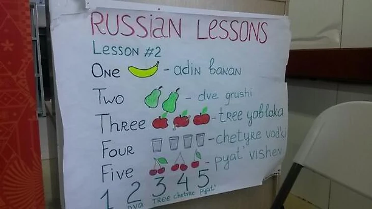 21.12 Кстати, в столовой горной деревни есть и такой забавный плакат, помогающий иностранным спортсменам учить русский язык. Но это больше для веселья – работники столовой знают английский. За фото спасибо коллегам из «Спорт-Экспресса».