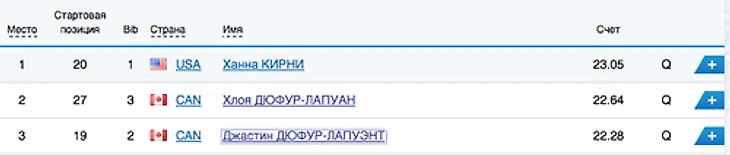 19.10 Заканчивая освещение женского могула, отметим, что тройку лидеров практически захватили сестры из Канады. Правда, на официальном сайте Игр им приписали разные фамилии.