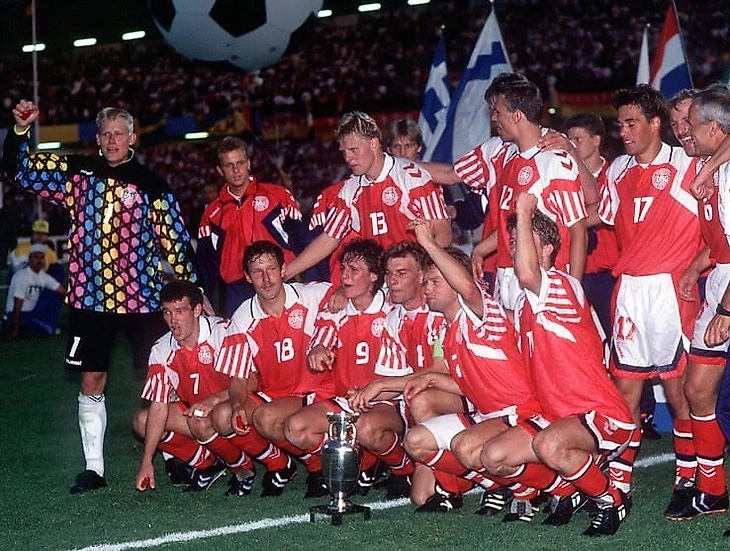Сборная Дании, Евро-1992. Легендарная чемпионская форма датчан. Тогда никто не мог подумать, что датчане дойдут до финала и прихлопнут в нем немцев со счетом 2-0. Отдельно, хочется отметить дизайн вратарского свитера Петера Шмейхеля, в котором он вышел на финальную игру.