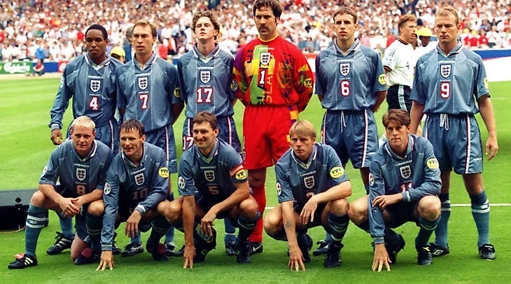 Сборная Англии, Евро-1996. Культовый дизайн с домашнего для англичан Евро. Оба комплекта хороши. В серой форме англичане играли в полуфинале, но по пенальти уступили немцам, тем самым став бронзовыми призерами.