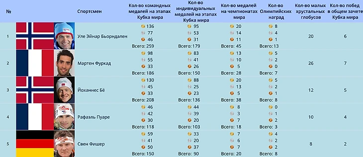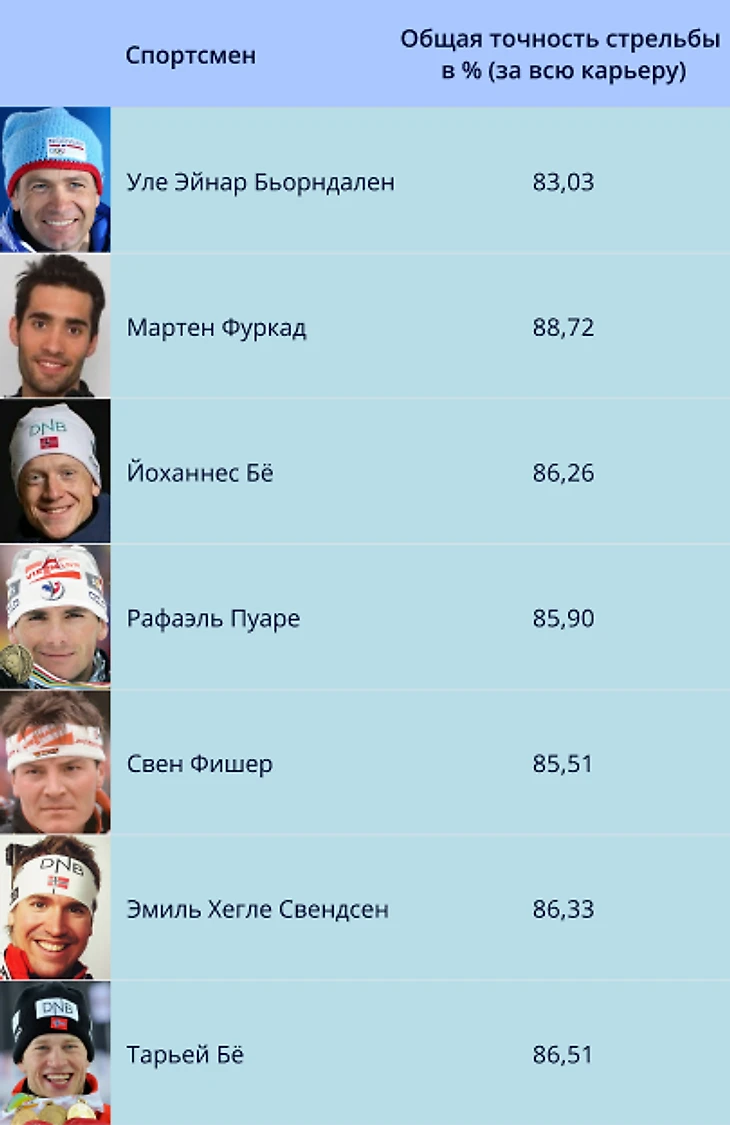 Цифровые данные для статьи были взяты с порталов биатлонной статистики: realbiathlon.com и biathlonstats.com, а также частично из wikipedia.org.