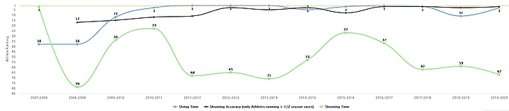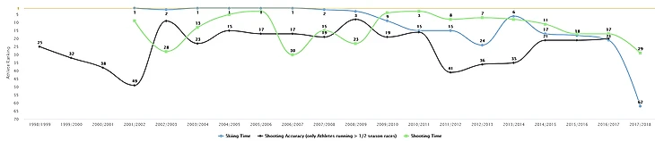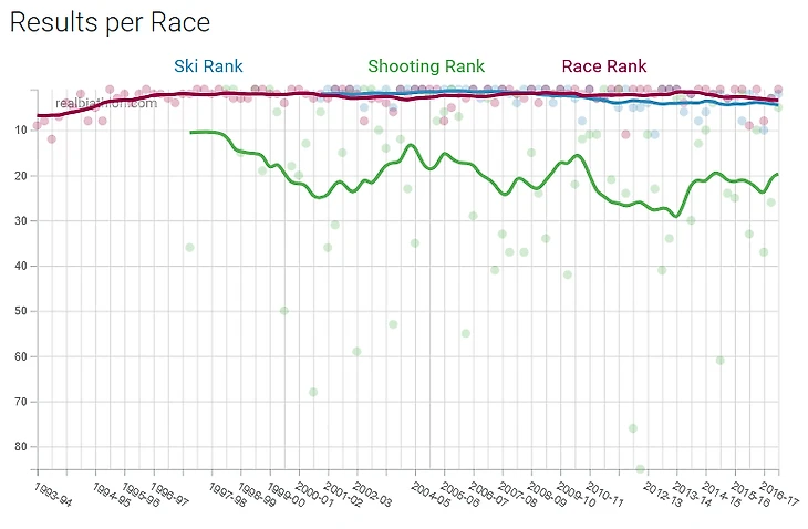 Интересное наблюдение: Мартен Фуркад доминировал (20% и более разницы в очках со вторым местом) 4 сезона, Йоханнес Бе – 2 сезона. Уле Эйнар Бьорндален не мог похвастаться настолько мощными сезонами, но имел уверенное преимущество (10% и более разницы в очках со вторым местом) лишь в двух последних своих сезонах на пиковом уровне, то есть оппозиция у Бьорндалена ослабла только тогда, когда ему было 34-35 лет.
