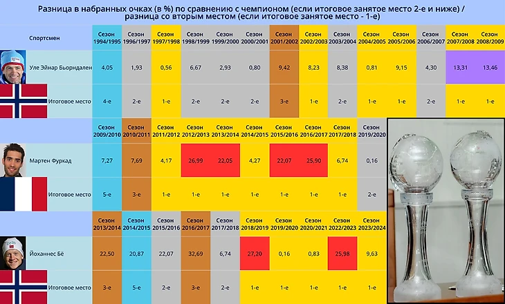 Тем не менее, чтобы голословно не обвинять Мартена Фуркада и Йоханнеса Бе в более слабой конкуренции, давайте обратимся к цифрам. В данной таблице была представлена разница в набранных очках (в %) спортсменом по сравнению с чемпионом в конкретном рассматриваемом сезоне (если итоговое занятое место биатлониста 2-е и ниже), либо же разница в набранных очках со вторым местом (если обозреваемый биатлонист стал чемпионом). Чем ниже разница в %, тем более конкурентный вышел сезон.