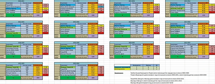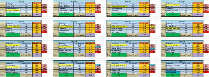 Небольшое отступление: для желающих посмотреть полную статистику по набранным очкам и разнице в % среди топ-5 лидеров Кубка мира, начиная с сезона 1994/1995 и заканчивая сезоном 2023/2024 – прикладываю два дополнительных скриншота.
