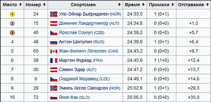 2. Конечно же Олимпийские игры в Сочи в 2014 году. О них нельзя не упомянуть. Уже заслуженный ветеран Бьорндален, несмотря на все сомнения по поводу его результатов на данном турнире, выиграл золотую медаль в спринте в 40-летнем возрасте. Причем победил он, допустив 1 промах. И кого же он победил, давайте посмотрим на топ-10 биатлонистов по итогам этой гонки.