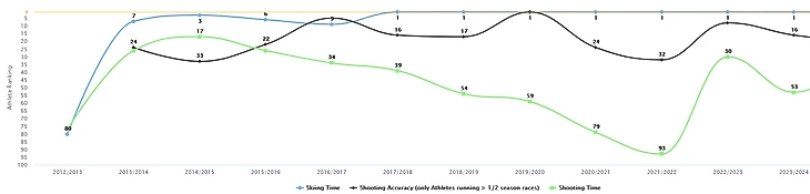 Йоханнес Бе, начиная с первого своего полного сезона показывает отличную скорость на трассе, ни разу не выпадая из топ-10. Начиная с сезона 2017/2018 и по сезон 2023/2024 являлся безоговорочным лидером по скорости (7 сезонов подряд). Делать выводы о нынешнем сезоне пока еще рано, но видно, что Йоханнес немножко сдал, возможно, еще даст всем прикурить напоследок на чемпионате мира, посмотрим.