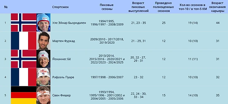 В таблице ниже представлено количество проведенных сезонов и возраст Бьорндалена и его главных конкурентов за величие в пиковые сезоны и на момент окончания карьеры.
