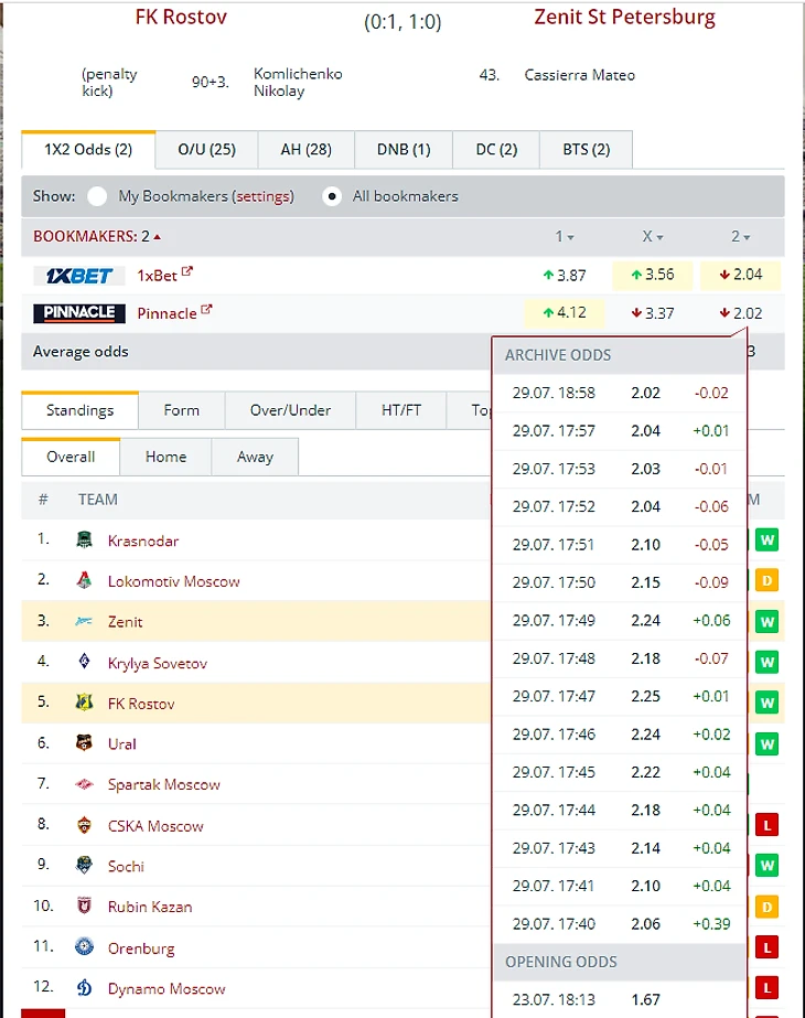 Линия на субботий матч открылась в Пиннакле в прошлое воскресенье примерно на прошлогоднем уровне –1,67 на победу команды Семака. Однако, потом «умные» деньги и новость о том, что «Ростов» все-таки сможет использовать своих новичков, подняли коэффициент до неожиданных 2.02 (46% с учетом все той же маржи букмекера). Напомню, что «Ростов» не подписал ни одной звезды мирового футбола, а сомнения касались того, смогут ли сыграть Чернов, Ионов, Акбашев и иранский «кот в мешке», о котором даже большинство профессиональных ставочников имели весьма смутные представления до субботего вечера.