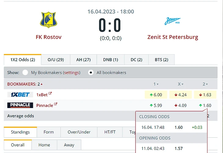 В момент открытия линии на весенний матч Пиннакл (она не является легальной букмекерской конторой в РФ, я использую ее коэффициенты в данном посте, потому что она считается самой «профессиональной» букмекерской контрой в мире) предлагал на «Зенит» кеф 1.57, закрылся же этот исход по 1.6. То есть рынок оценил вероятность победы питерцев в 59% с учетом чуть округленной маржи букмекера в 3,5 % (напомню, что для того, чтобы перевести коэффициент в % вероятности нужно разделить 100 на нужный вам кеф)