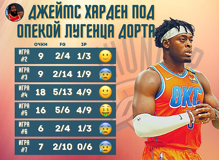 Главное открытие «Оклахомы» в это плей-офф — канадский новичок Лугенц Дорт. Приземистый защитник — настоящий мини-танк в профиль — оказался довольно качественным противоядием Джеймсу Хардену и сумел существенно понизить его эффективность.