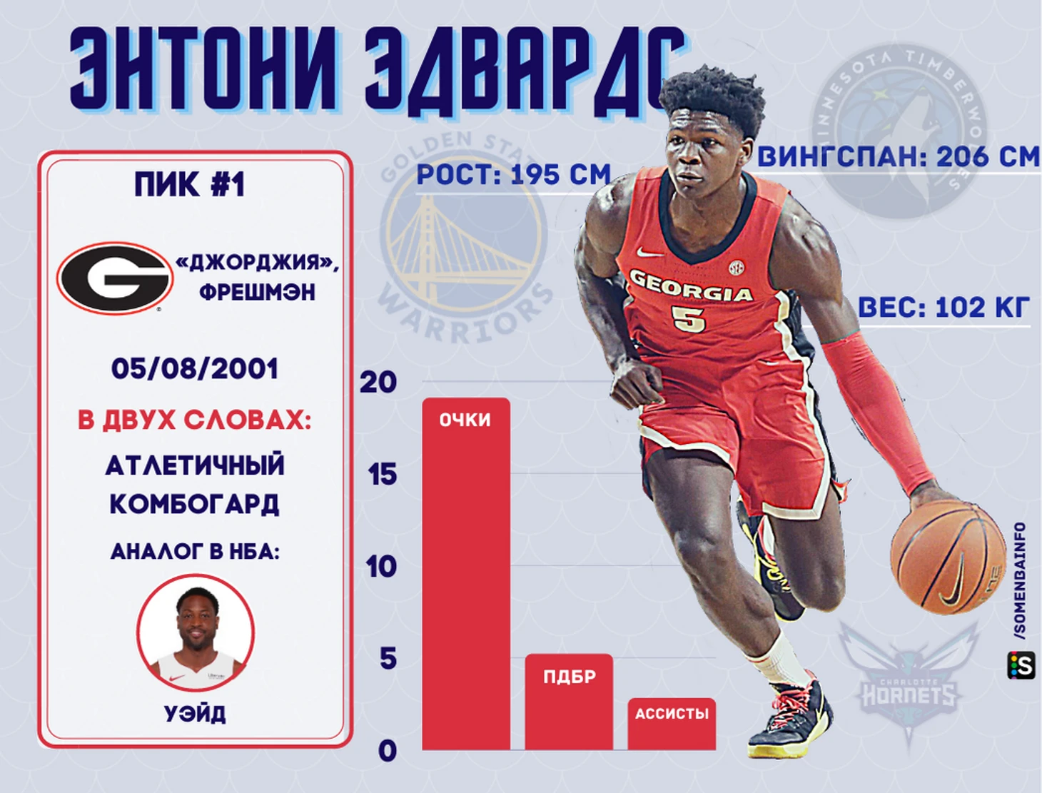 На фоне остальных сравнительно крепко смотрится Энтони Эдвардс. Атлетичный комбогард из «Джорджии» и полный тезка актера, игравшего Гуса в «Лучшем стрелке», вообще не падает ниже второго пика: скаутами одновременно рассматривается как игрок, способный приносить пользу прямо сейчас, и как парень с самым большим потенциалом.