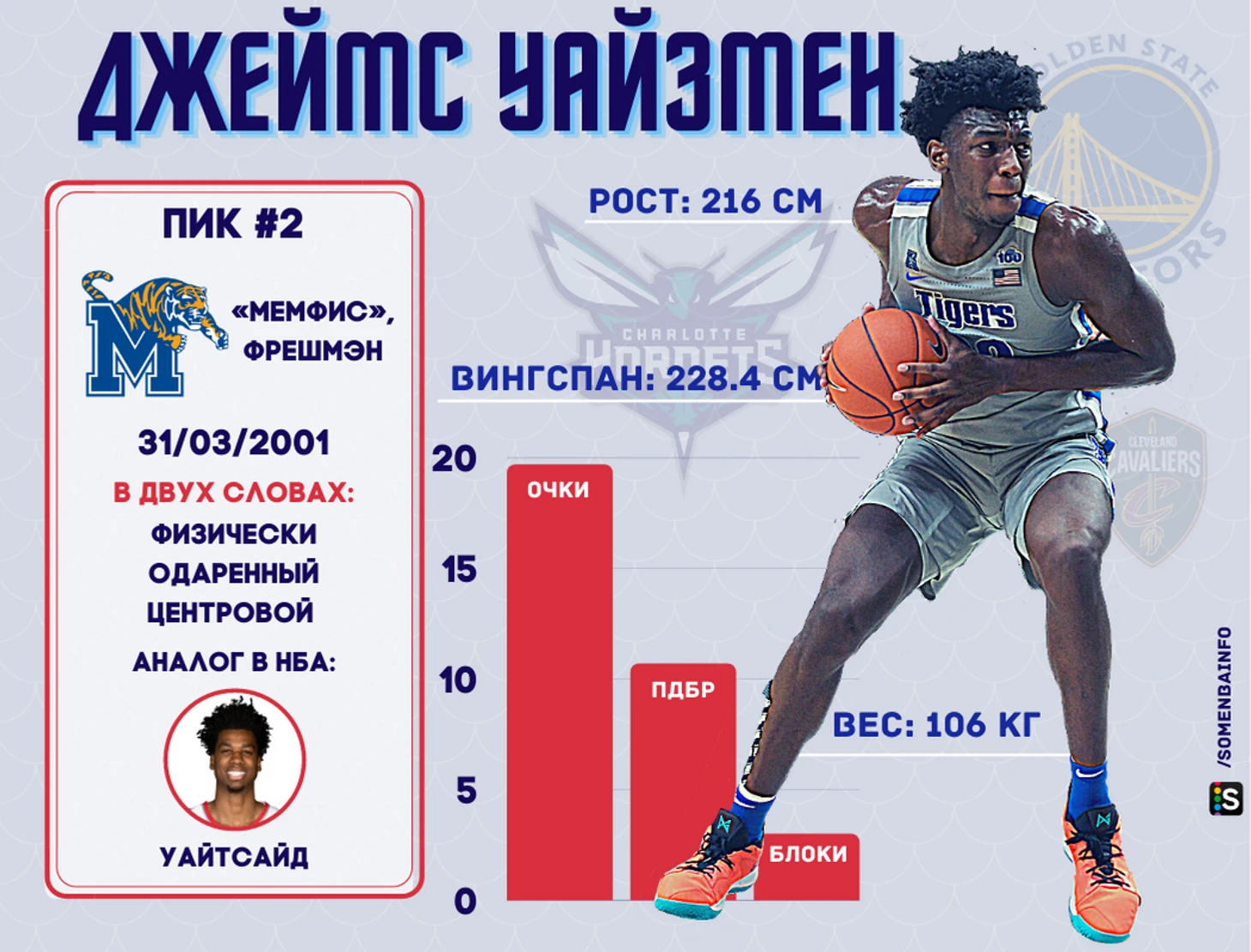 На пару пиков вниз за Уайзменом имеет смысл опускаться «Миннесоте», чтобы по зову тендеций построить своего двухбашенного монстра. Вполне пригодился бы центровой и в «Шарлотт»: окружив Джеймса снайперами, это все вполне могло бы заиграть. «Хорнетс» это понимают, и обязательно выберут его в случае, если Уайзмен будет доступен под третьим пиком.