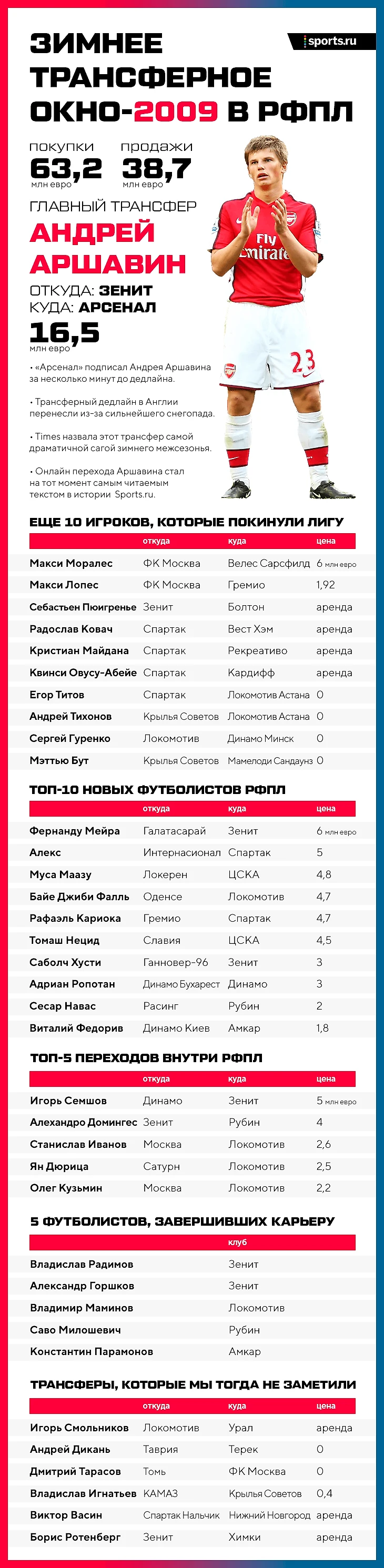 Трансферное окно РПЛ 10 лет назад: Аршавин успел в «Арсенал», а к нам приехали Алекс, Навас и Кариока