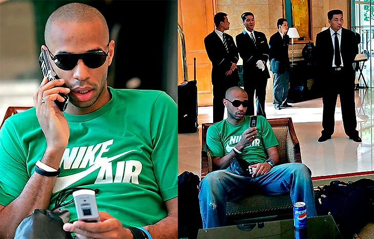 Еще эффектнее с двумя мобильниками (если кто-то узнал модели, пишите в коментах) выглядит Тьерри Анри. Он заехал в Китай с трехдневным визитом. Наверняка где-то рядом и третий телефон. Расслабленный Анри – мегазвезда на этих снимках.
