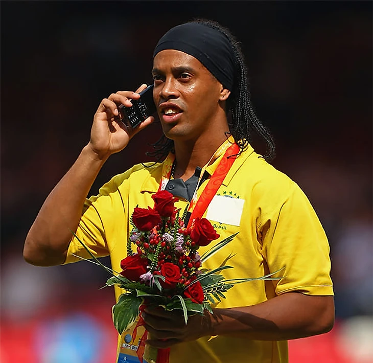 Тот же год. В правой руке Роналдо – Siemens SK65. Необычный боковой слайдер с QWERTY-клавиатурой, который при раскрытии превращался в крест. Бразилец на презентации телефона сказал, что пользуется им с удовольствием.