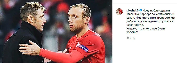 Это продолжалось около месяца, но после поражения тульскому «Арсеналу» Массимо Карреру уволили. Глушаков выложил прощальный пост в любимом инстаграме, снабдив его не самой веселой фотографией.