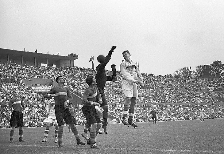 Первое впечатление от увиденного на стадионе футбола было всего ближе к разочарованию. Полупустые и мокрые скамейки трибун, бурые от моросящего дождя (в дальнейшем дождь никогда не портил мне зрелища футбола), скромная афиша: московское «Динамо» играло с «Крыльями». «Динамо» проиграло, Хомич пропустил гол – рушились легенды и мифы, питавшие воображение мое в предвкушении футбола.