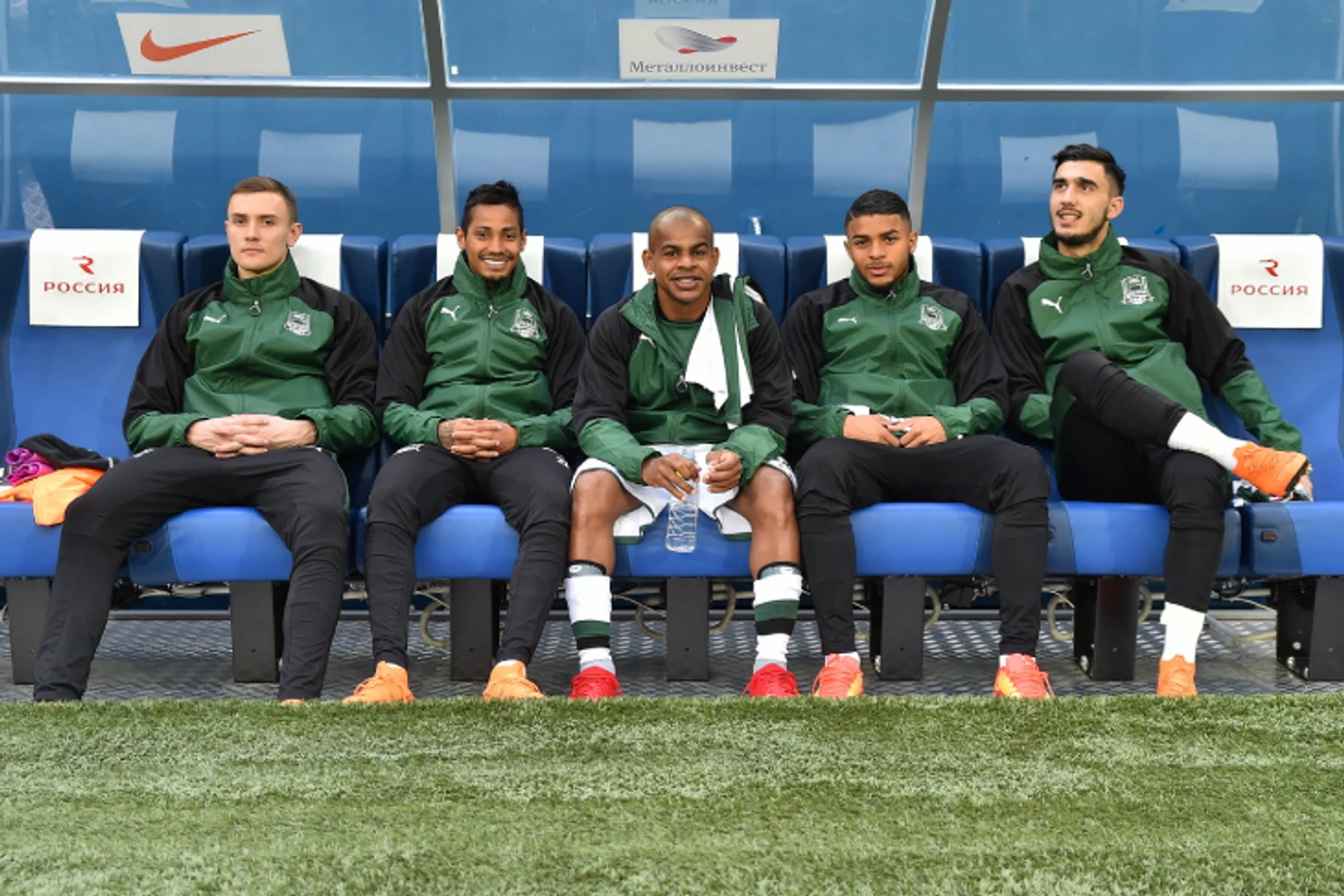 7 апреля 2018-го Мурад Мусаев дебютировал как главный тренер «Краснодара» – в Петербурге, против «Зенита» Манчини. В ворота молодой тренер поставил Андрея Синицына, а в запас заявил двух вратарей – Станислава Крицюка и Евгения Латышонка. Вот он – с Лаборде, Жоаозиньо, Вандерсоном и Иваном. Единственный, кто не улыбается.