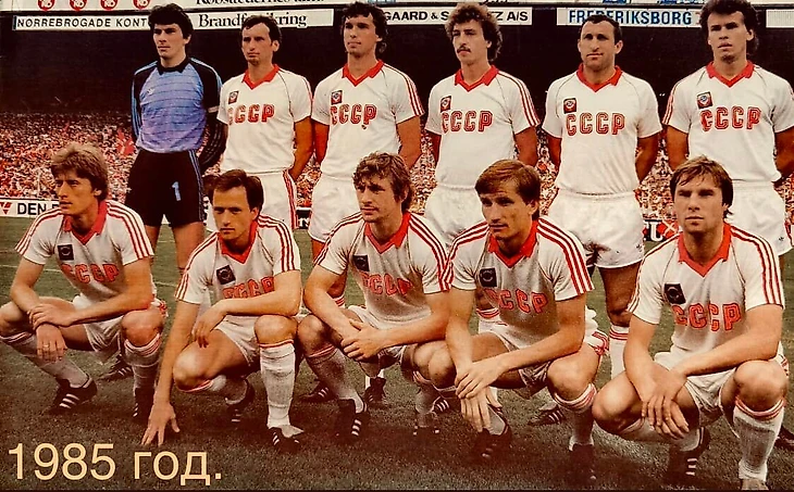 1985г. Дания - СССР (4:2). Один из тех, по сути, матчей, когда "Весёлый" Футбол Э.Малофеева потерпел весьма болезненное (а то и сокрушительное!) Фиаско, поставив Сб.СССР перед полной Катастрофой: Невыхода на ЧМ-86, даже Вторым местом... Слева напр, сидя: С.Балтача - И.Беланов - Б.Поздняков - С.Гоцманов - А.ДЕМЬЯНЕНКО. Стоя: Р.Дасаев - Ю.Гаврилов - О.ПРОТАСОВ - С.Алейников - Т.Сулаквелидзе - Г.ЛИТОВЧЕНКО.