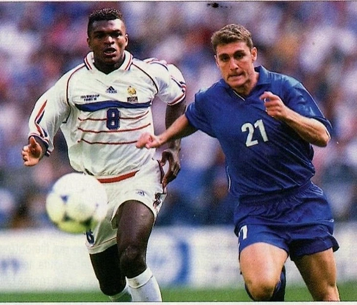 ЧМ-1998. 1/4 Финала, Франция - Италия. Великолепный итальянский Таранный Форвард- Бомбардир - Кр.ВЬЕРИ (№21) в борьбе с Монументальным французским Защитником - М.Десайи...