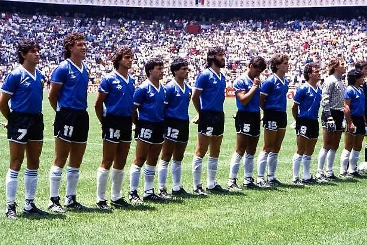 Аргентина - победитель Кубка Мира-1986. Слева-напр: БУРРУЧАГА - Вальдано - Джусти - Олартикоэчеа - Эктор ЭНРИКЕ - Батиста - Браун - Руджери - Кусиуффо - Пумпидо - МАРАДОНА (перед матчем 1/4 финала, с Англией).