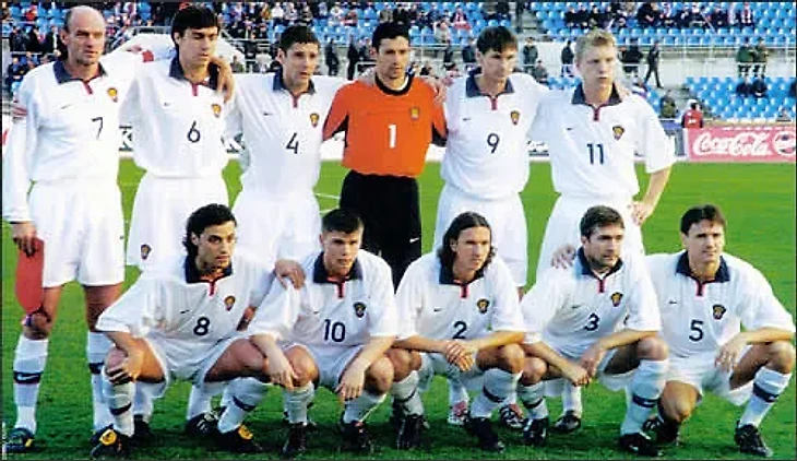 2001г. Россия - Швейцария (4:0). Отличный Победный Аккорд, блестяще выигранного Отборочного Турнира, Идейной в Своём Созидательном Игровом Почерке, Сборной О.И.Романцева! Слева-напр, стоя: В.Онопко - Ю.Ковтун - И.Чугайнов - Р.Нигматуллин - Е.ТИТОВ - В.Бесчастных. Сидя: Р.Гусев - М.ИЗМАЙЛОВ - А.Смертин - Ю.Дроздов - Д.АЛЕНИЧЕВ.