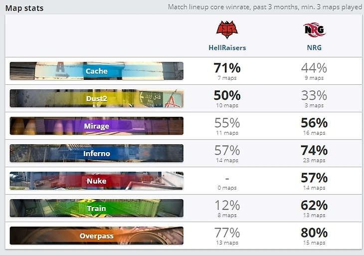 Статистика говорит о многом. Сразу вычёркивается dust2 (бан NRG) и карта nuke (бан HR), а вот далее есть хороший выбор. На пик думаю будут забирать карту cache/mirage (одни из нестабильных карт для NRG, как и для HR) или карту infenro, но там всё тоже под вопросом.