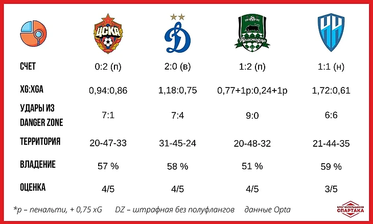 Если рассматривать показатели допущенных ожидаемых голов без учета пенальти (NPxGa), то у «Спартака» 4-я оборона в лиге. Меньше моментов у своих ворот позволяют создавать только «Зенит», «Динамо» и «Краснодар». При этом красно-белые пропустили уже 31 гол (при 20,55 NPxGa).