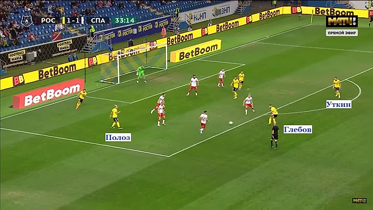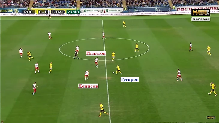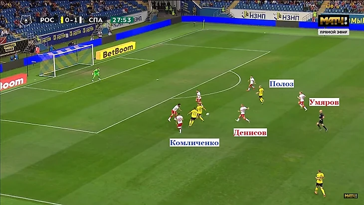 Соболев и Промес отыграны. Остальные не включаются в давление. Игнатов и Денисов вяло обозначают отбор. Тугарев спокойно двигается вперед.