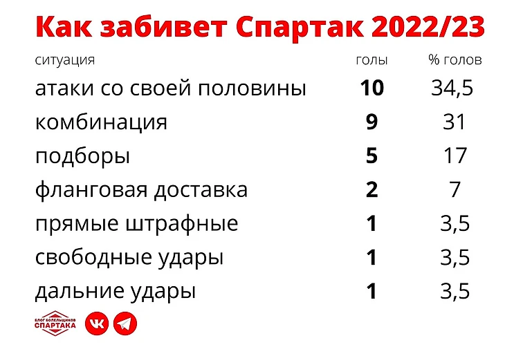 Подавляющее большинство голов спартаковцы забивают после того, как завладевают мячом в районе чужой трети поля. Далее следует короткая комбинация с точным завершающим ударом или же успешные действия на подборе. По-прежнему эффективны быстрые выходы со своей половины. «Спартак» редко забивает в результате кроссов штрафную, в том числе – после стандартов.