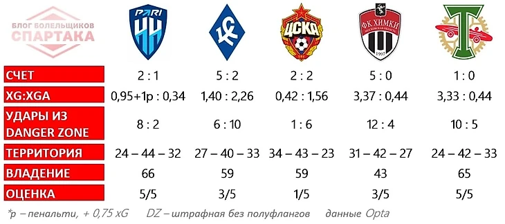 Хорошая реализация. Главный критерий эффективности игры в атаке – разница между реальными голами и xG (без пенальти). В этом месяце «Спартак» забил почти на 6 голов выше ожидаемого. Очевидный контраст с предыдущими отрезками сезона.