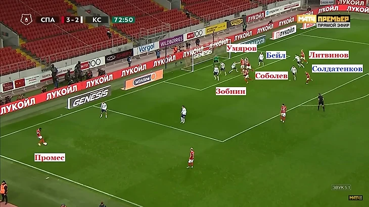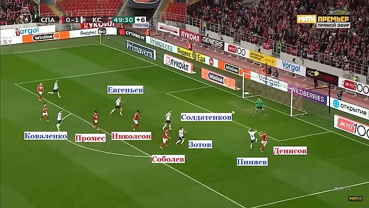 В момент разбега Промеса Умяров блокирует одного из центральных защитников, а Соболев и Зобнин совершают отвлекающий маневр – движение к ближней штанге. Квинси навешивает на дальнюю. Литвинов выскакивает из-за соперника. Наигранная комбинация.