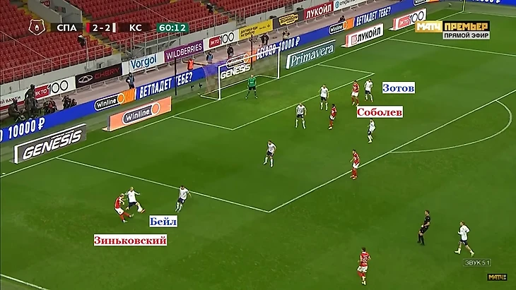 Зиньковский классно раскачал Бейла и выполнил идеальную подачу на дальнюю штангу. Соболев забил из-под другого крайнего защитника – Зотова. Отмечаем не только исполнительское мастерство голеодора и ассистента.
